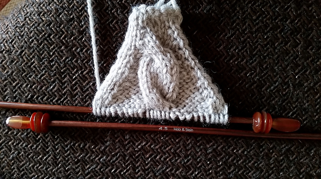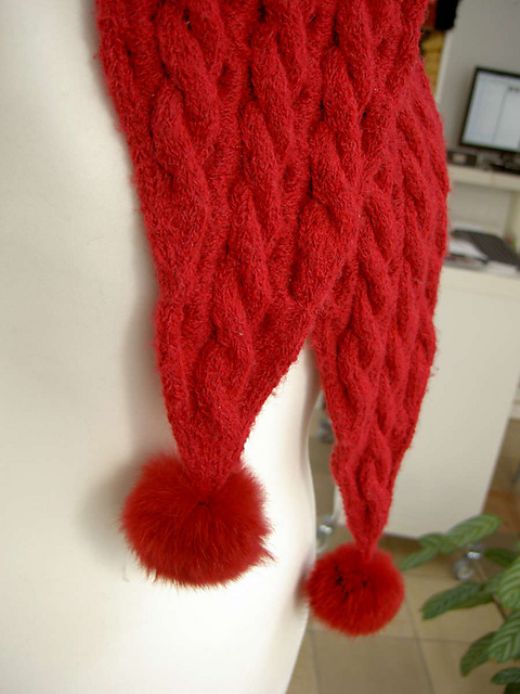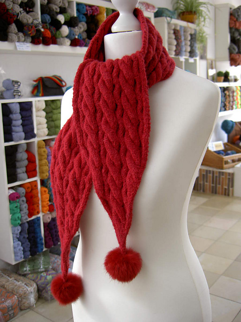 Hier werden auf der Vorder- und der Rückseite Zöpfe gearbeitet. Daher hat der Schal keine linke Seite. Die Spitzen mit den Fellbommeln sind ein zusätzlicher Blickfang. Das strukturierte Muster und das flauschige Alpacagarn macht den Schal zu einem warmen Begleiter.