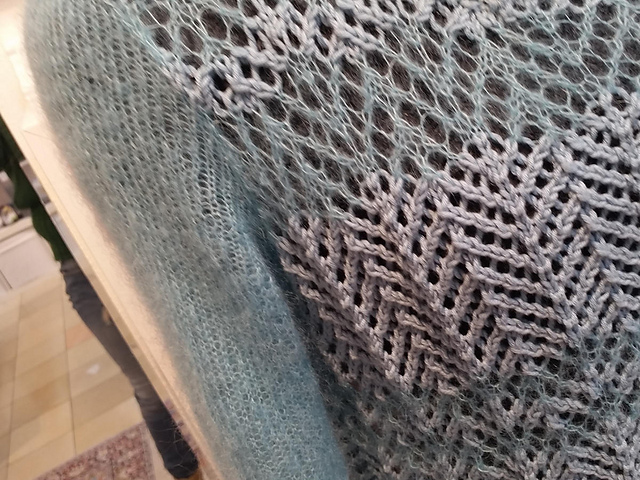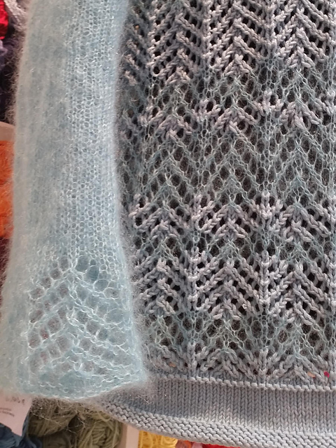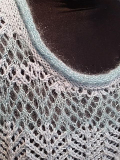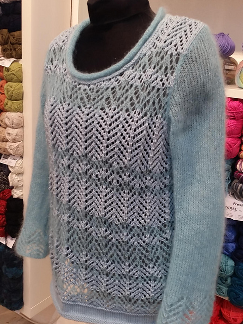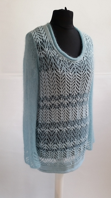 Ideal fürs Frühjahr ist dieser Pullover im Materialmix. Die Streifen aus 2 verschiedenen Materialien sind Ton in Ton gehalten und das luftige Ajourmuster auf Vorder- und Rückenteil unterstreichen den legeren Schnitt. Die Ärmel aus Mohair sind glatt gestrickt und haben nur an der unteren Kante das Lochmuster.