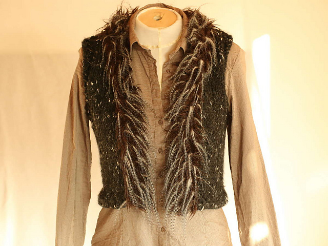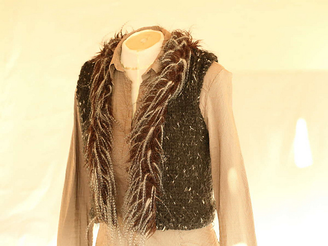 Die mit Nadel 10 gestrickte Weste ist in einem Stück gestrickt und für die Armausschnitte werden einfach einige Maschen abgekettet. Die Blende mit Perlmuster wird direkt mitgestrickt. So gibt es nur die Nähte an der Schulter und es sind wenige Fäden zu vernähen. Der Webpelz wird nachträglich aufgenäht und kann natärlich auch weggelassen werden. Dieses Modell ist kurz und geht nur bis zur Taille. Es ist ideal zu Blusen und T-Shirts zu kombinieren.